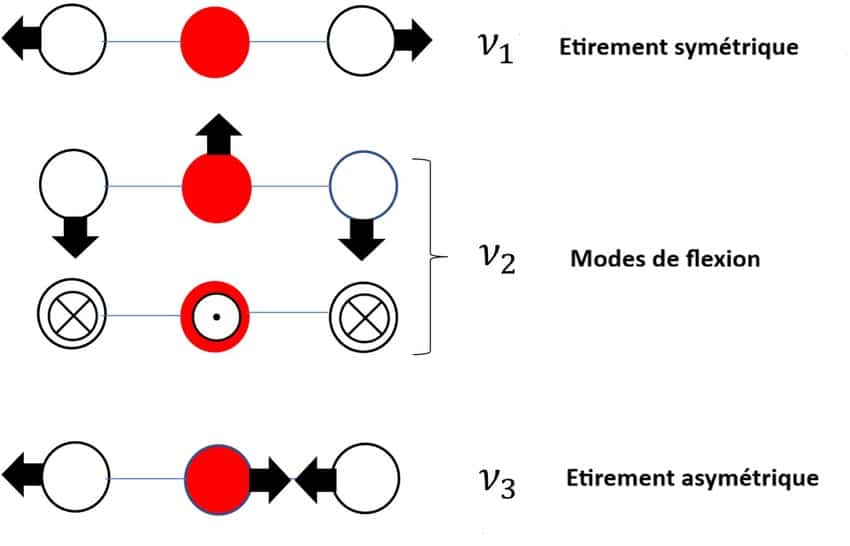 - Le dioxyde de carbone (CO2) : bien qu’il soit symétrique au repos, il est composé de trois atomes. Lorsqu’il reçoit de l’énergie, il peut se tordre ou s’étirer de façon asymétrique (un côté plus long que l’autre) de 3 façons différentes (voir schéma). Cette « danse » déséquilibrée lui permet de capturer le rayonnement infrarouge au passage.