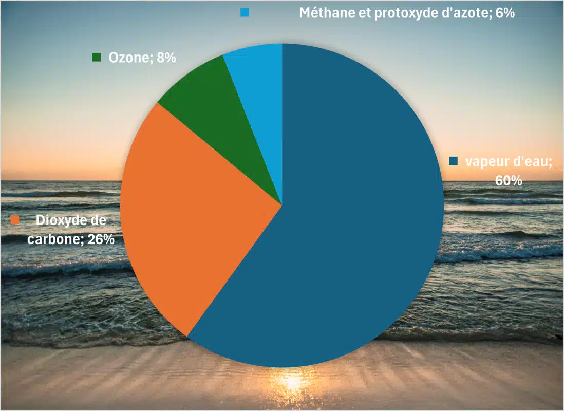 L’eau constitue le principal gaz à effet de serre (60 % en l’absence de nuages), devant le dioxyde de carbone (26 %)