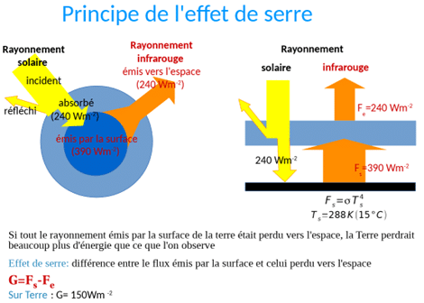 Pour éviter une surchauffe, la Terre réémet cette énergie vers l’espace sous forme de rayonnement infrarouge (λ ≈ 10 µm). Lorsque notre planète émet dans l’espace, autant qu’elle reçoit du soleil, elle atteint alors sa température d’équilibre.