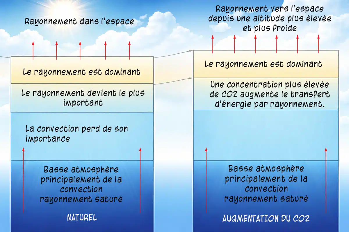 À gauche (situation normale) : équilibre naturel entre convection et rayonnement au sein de l’atmosphère.
