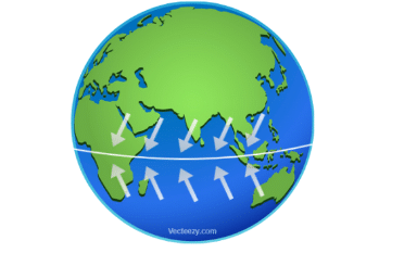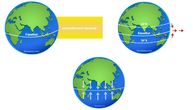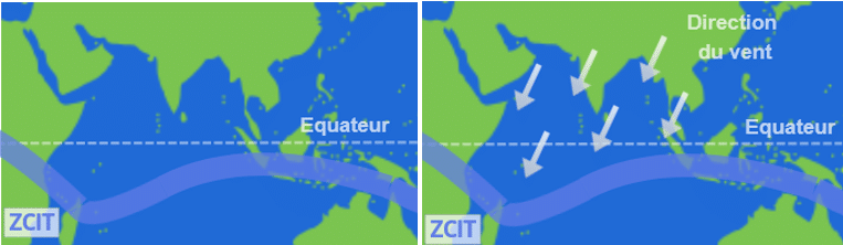 Le soleil irradie la Terre et apporte l’énergie nécessaire à son réchauffement. C’est au niveau des latitudes proches de l’équateur que la Terre reçoit le plus d’énergie solaire. Dans cette zone, l’énergie reçue par le soleil réchauffe l’air plus fortement qu’ailleurs. L’air plus chaud s’élève créant une zone de basse pression qui attire les vents des régions voisines. Les mouvements d’air s’établissent d’une part entre le tropique du cancer (au nord) et l’équateur, et d’autre part entre le tropique du capricorne (au sud) et l’équateur. Cette zone de rencontre des vents porte un nom : la Zone de Convergence InterTropicale (ZCIT).