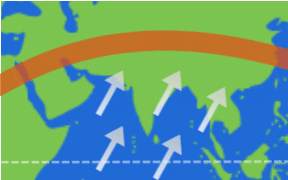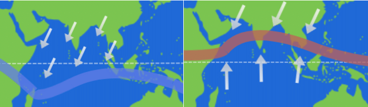 - En été : les vents viennent de l’océan vers les terres. L’air humide provoque de fortes pluies, c’est la saison des pluies.