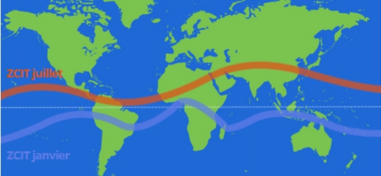 En été, l’énergie reçue par le soleil est plus importante dans l’hémisphère nord. Elle passe de l’hémisphère nord à l’hémisphère sud en automne. Durant l’hiver, elle est plus importante dans l’hémisphère sud. Enfin, elle repasse de l’hémisphère sud à l’hémisphère nord durant le printemps. Comme la Zone de Convergence InterTropicale se situe là où il fait plus chaud, elle suit la même dynamique. Ainsi, la ZCIT se situe vers le tropique du Cancer en été et vers le tropique du Capricorne en hiver.