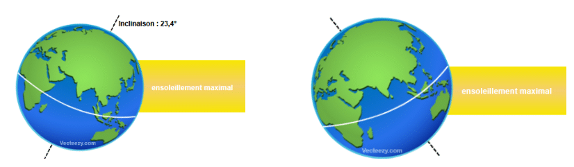- L’inclinaison de l’axe de rotation de la Terre déplace la zone de plus fort ensoleillement entre les hémisphères. Ceci est à l’origine des saisons.